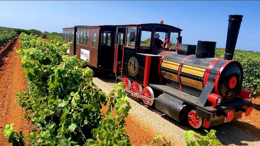 Te damos la bienvenida en el portal de Bodegas Vi Rei y recorremos los viñedos mejor cuidados de Baleares en nuestro tren emblemático. En este trayecto, recibes información sobre las variedades más importantes, tanto locales como internacionales, y te explicamos el ciclo anual de la vid y su cultivo. A continuación, tiene lugar la visita guiada por la producción. En ella, conocerás la sala de fermentación, la sala de barricas y la zona de embotellado, para terminar en la sala de catas de vino*.